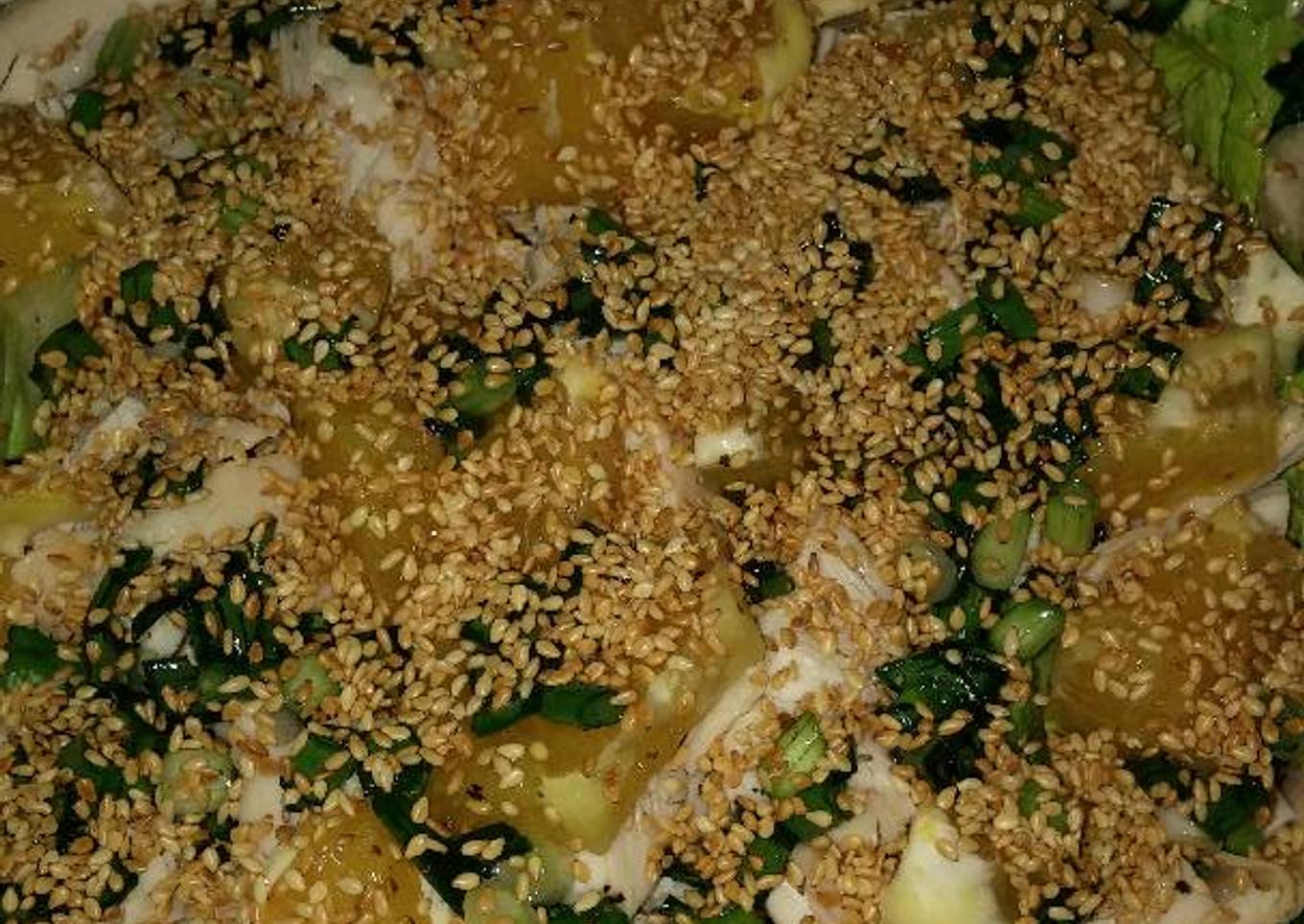 - Combine the salad ingredients in large bowl 🍜. Mix the dressing ingredients, and blend well. Pour over salad just before serving. Add Mandarin orange if desired. Enjoy