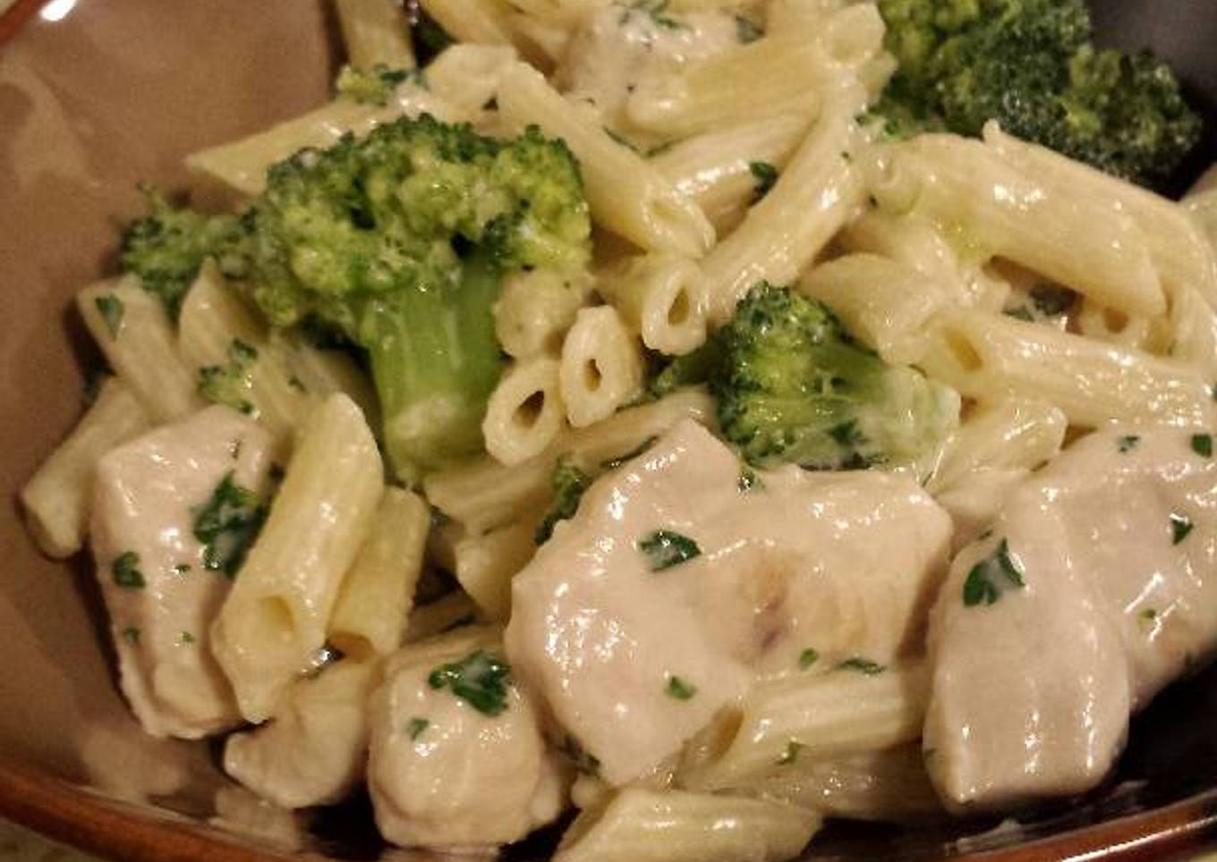 - Time to assemble strain your pasta add back to large pot add broccoli chicken Parsly and finally add sauce slowly stirring it in until evenly distributed and serve... serves 8 to 10