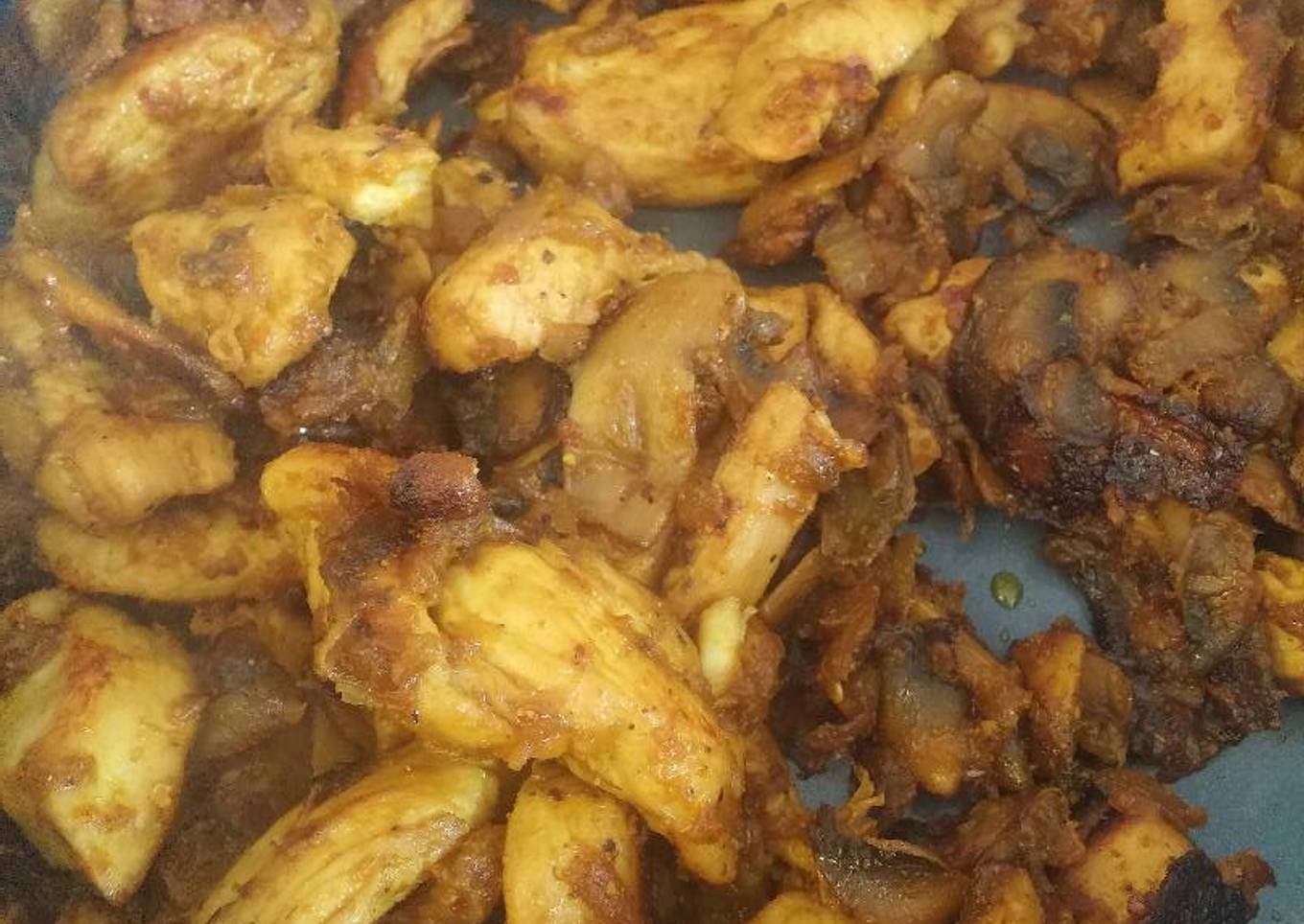 - Cut the onions and mushroom into large pieces. Cut the the chicken breast into 1 cm stripes. Put the chicken stripes in a large bowl and add 1 teaspoon of salt and pepper.