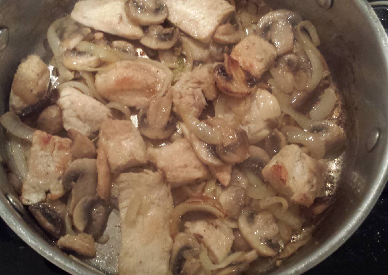 - Turn burner on medium and continue to cook until mushrooms and onions are cooked and chicken starts to brown a little.